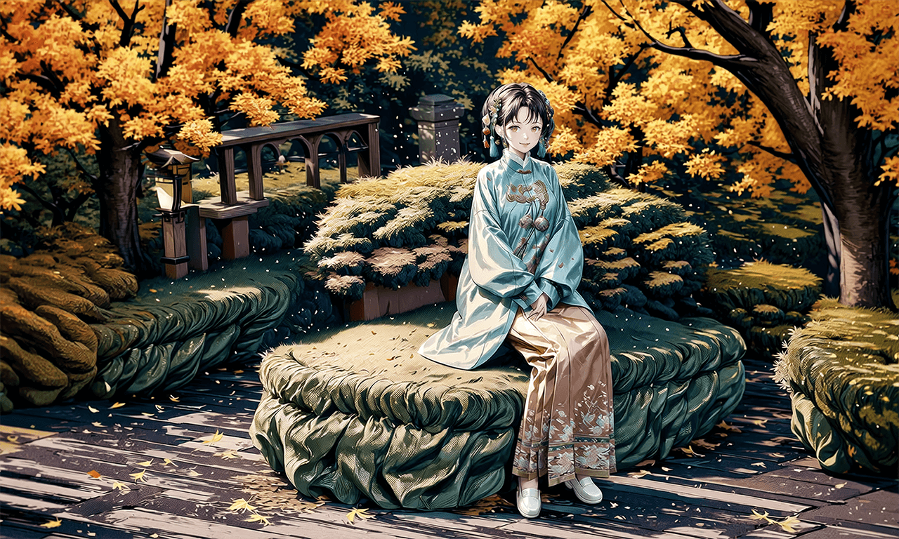当然,这并不是梦。翌日,待我踱步至此时,一位女子已经坐在了长石上。她一袭青色褂衫,素色马面裙,盘起的发髻上,梧桐叶状的装饰与青色流苏挂饰点缀着几分灵动。她像大家闺秀般亭亭玉立,温文尔雅,笑容甜美,青春洋溢的外表下隐隐透着成熟。虽然身形纤弱,却有着梧桐树一般的庄重。