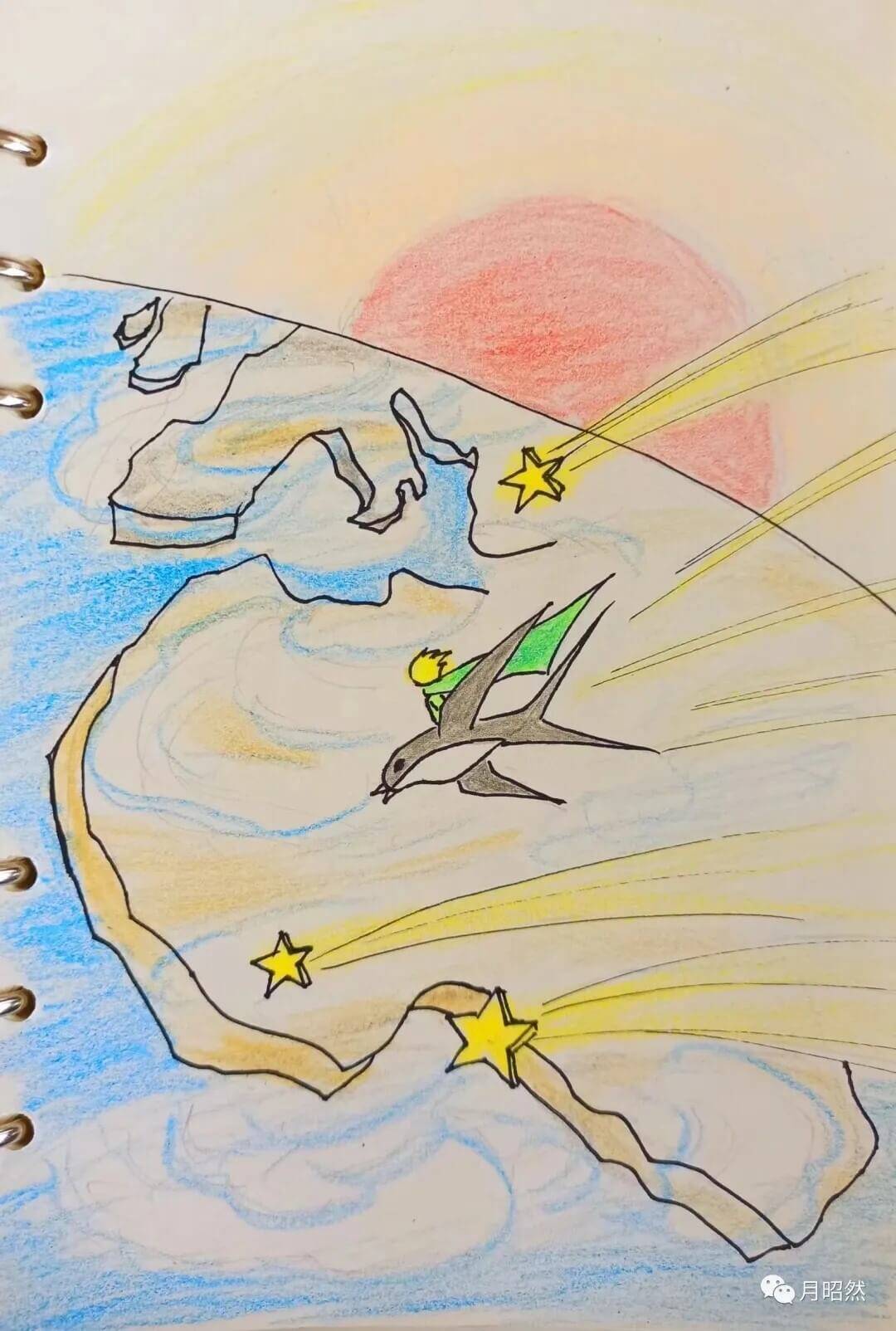 现在我的悲伤稍稍有些平复了,这也意味着,还没有完全平复。但我知道,他回到了他的行星,因为我在黎明没有找到他的身体。他的身体并不重……在夜晚,我爱上了倾听星星的声音,就像五亿个小铃铛在叮当作响……