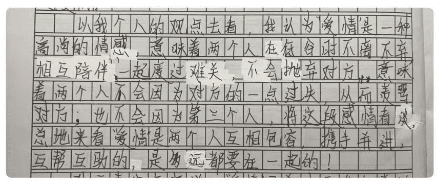 男生写道:“以我个人的观点来看,我认为爱情是一种高尚的情感,意味着两个人在低谷时不离不弃,互相陪伴,一起渡过难关,不会抛弃对方;意味着两个人不会因为对方的一点过失,从而责骂对方;也不会因为第三个人,将这段感情看淡。总的来看,爱情是两个人互相包容,携手并进,互帮互助的,是多远都要在一起的!“